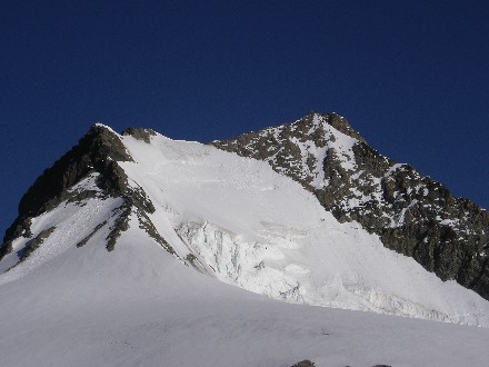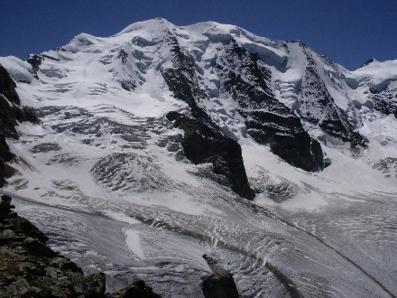 Route: Diavolezza - Fortezza Grat - Bellavista Plateau - Piz Zupo - Rif.Marco e Rosa - Spallagrat - Piz Bernina - Rif.Marco e Rosa - Fortezza Grat - Diavolezza. Piz Bernina von Osten: links der Spallagrat, rechts der Biancograt. |