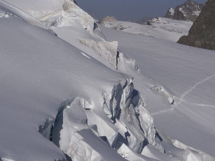 Gletscherspalten unterwegs zum Rifugio Marco e Rosa. |