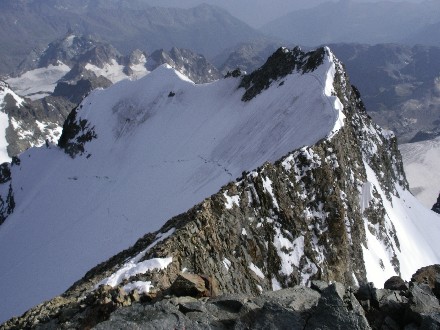 Schöne Sicht vom Piz Bernina auf nicht so überlaufene Gipfel (von rechts): Piz Argient, Piz Zupo, einige Bellavista Gipfel. |