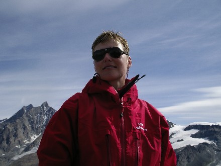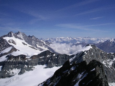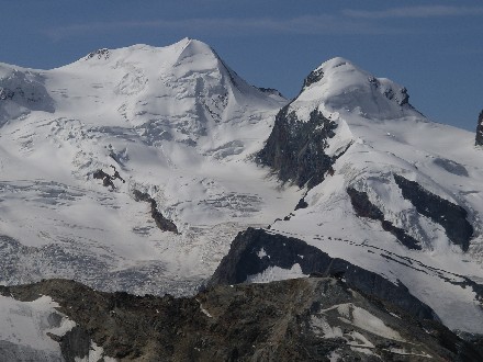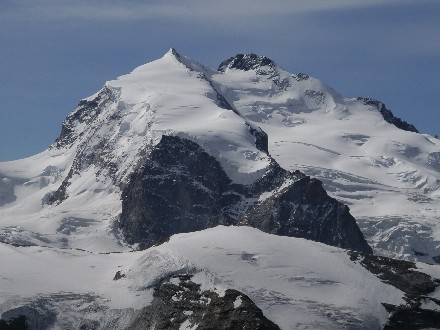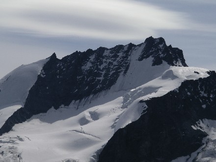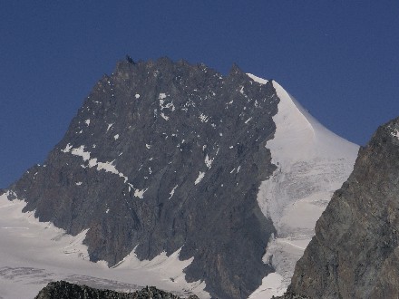 Route: Britannia Hütte - Allalingletscher - Allalinpass 3564m - am Westfuss des Rimpfischhorns entlang - über die Westflanke auf den Grat - Gipfel - Abstieg wie Aufstieg. Die Westseite. Rechts die Westflanke und der Hauptgipfel. |