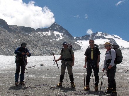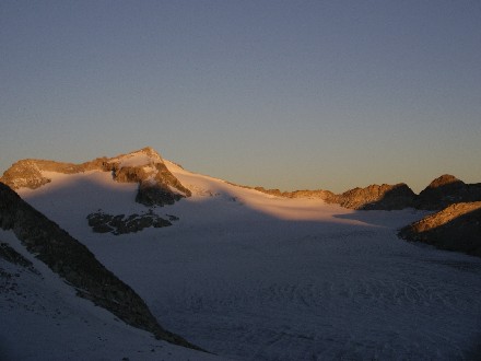Die ersten Sonnenstrahlen treffen uns unterwegs Richtung Adamello. |