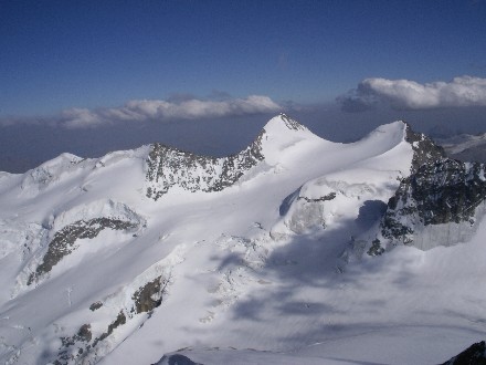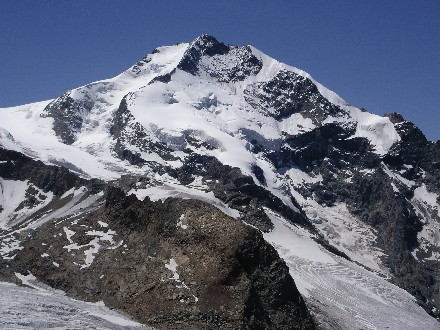 Route: Diavolezza - Fortezza Grat - Bellavista Plateau - Piz Zupo - Rif.Marco e Rosa - Spallagrat - Piz Bernina - Rif.Marco e Rosa - Fortezza Grat - Diavolezza. Piz Bernina von Osten: links der Spallagrat, rechts der Biancograt. |