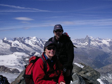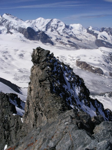 Route: Britannia Hütte - Allalingletscher - Allalinpass 3564m - am Westfuss des Rimpfischhorns entlang - über die Westflanke auf den Grat - Gipfel - Abstieg wie Aufstieg. Die Westseite. Rechts die Westflanke und der Hauptgipfel. |